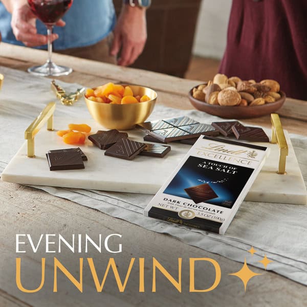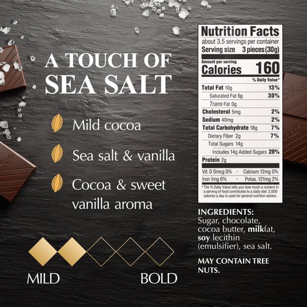Dive into the refined richness of Lindt EXCELLENCE Sea Salt Dark Chocolate with all your senses. EXCELLENCE Touch of Sea Salt reveals the intensity of dark chocolate and the seasoning of hand harvested sea salt crystals. The sophisticated flavors in this dark chocolate candy bar make this gourmet chocolate the perfect pairing with after-dinner drinks. Give these premium dark chocolate bars as gifts to your favorite chocolate connoisseur, or use them as baking chocolate for extra delicious desserts. This Lindt dark chocolate bar comes portioned into bite size squares, ensuring balanced complexity in each bite. Lindt chocolate is masterfully crafted using the highest-quality ingredients from world-renowned regions, embodying the passion and craftsmanship of Lindt Master Chocolatiers. *Information online not complete; check label of actual product being purchased.*