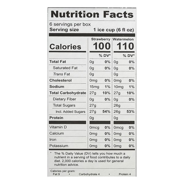 Strawberry Ingredients: Water, High Fructose Corn Syrup, Corn Syrup, Sugar, Strawberry Puree With Natural Flavors, Citric Acid, Dextrose, Lecithin (soy), Guar Gum, Xanthan Gum, Carrageenan, Red #40, Blue #1, Watermelon Ingredients: Water, High Fructose Corn Syrup, Corn Syrup, Sugar, Artificial Flavor, Citric Acid, Dextrose, Lecithin (soy), Guar Gum, Xanthan Gum, Carrageenan, Red #40.