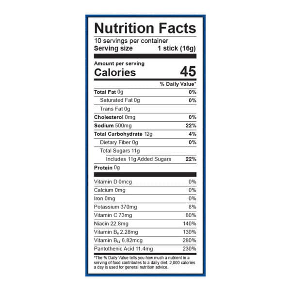 Pure Cane Sugar, Dextrose, Citric Acid, Salt, Potassium Citrate, Sodium Citrate, Dipotassium Phosphate, Tartaric Acid, Silicon Dioxide, Vitamin C (Ascorbic Acid), Rebaudioside-A (Stevia Leaf Extract), Natural Flavor, Vitamin B3 (Niacinamide), Vitamin B5 (D-Calcium Pantothenate), Vitamin B6 (Pyridoxine Hydrochloride), Vitamin B12 (Cyanocobalamin)