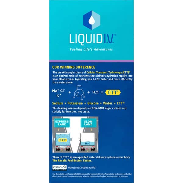 Cellular Transport Technology, or CTT®, is the breakthrough delivery system used in all Liquid I.V. products, designed to enhance rapid absorption of water and other key ingredients into the bloodstream.