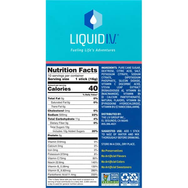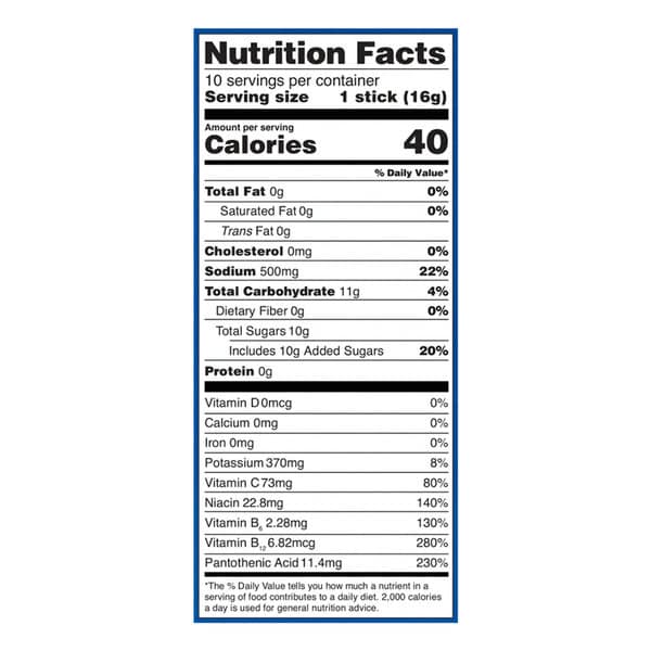 Cane Sugar, Dextrose, Citric Acid, Salt, Potassium Citrate, Sodium Citrate, Dipotassium Phosphate, Silicon Dioxide, Vitamin C (ascorbic Acid), Stevia Leaf Extract (rebaudioside A), Vitamin B3 (niacinamide), Vitamin B5 (calcium D-pantothenate), Natural Flavors, Vitamin B8 (pyridoxine Hydrochloride), Vitamin B12 (cyanocobalamin)