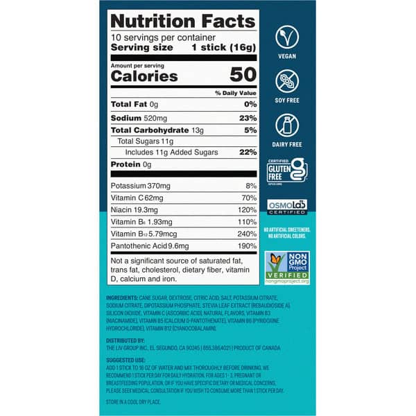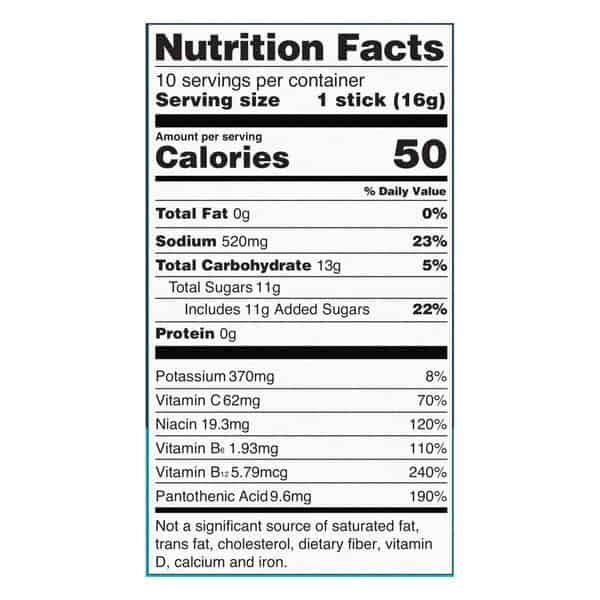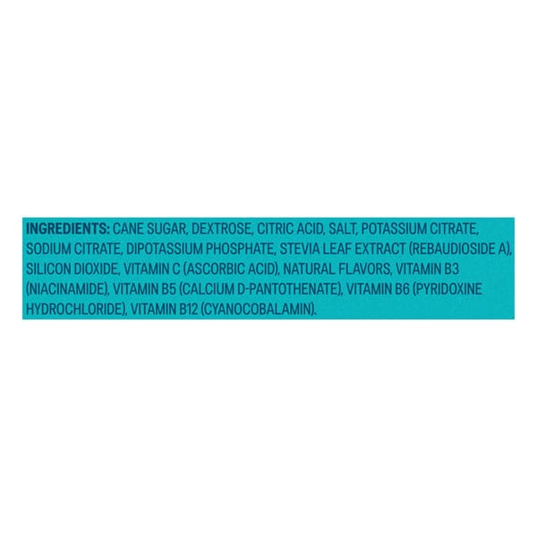 Pure Cane Sugar, Dextrose, Citric Acid, Salt, Potassium Citrate, Sodium Citrate, Dipotassium Phosphate, Silicon Dioxide, Rebaudioside A (Stevia Leaf Extract), Vitamin C (Ascorbic Acid), Natural Flavor, Vitamin B3 (Niacinamide), Vitamin B5 (D-Calcium Pantothenate), Vitamin B6 (Pyridoxine Hydrochloride), Vitamin B12 (Cyanocobalamin)