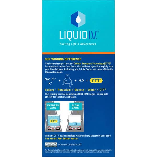 Cellular Transport Technology, or CTT®, is the breakthrough delivery system used in all Liquid I.V. products, designed to enhance rapid absorption of water and other key ingredients into the bloodstream.