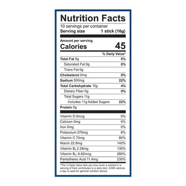 Pure Cane Sugar, Dextrose, Citric Acid, Salt, Potassium Citrate, Sodium Citrate, Dipotassium Phosphate, Silicon Dioxide, Rebaudioside A (Stevia Leaf Extract), Natural Flavor, Vitamin C (Ascorbic Acid), Vitamin B3 (Niacinamide), Vitamin B5 (D-Calcium Pantothenate), Vitamin B6 (Pyridoxine Hydrochloride), Vitamin B12 (Cyanocobalamin)