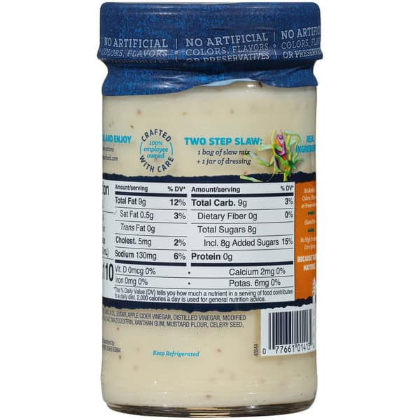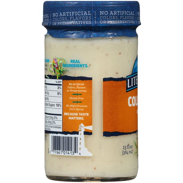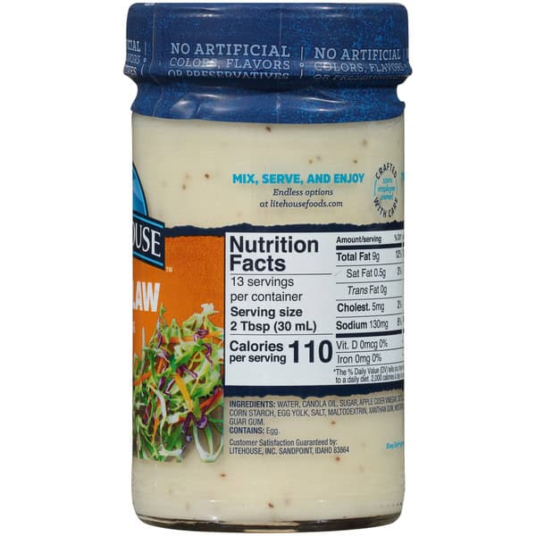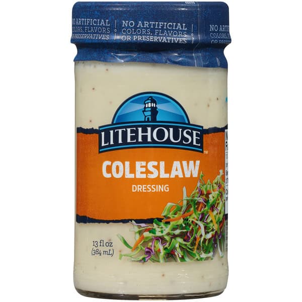 No artificial colors, flavors or preservatives. Gluten Free No high fructose corn syrup. Real ingredients. Because taste matters. Mix, serve, and enjoy. 100% employed owned crafted with care. Two Step Slaw: 1 bag of slaw mix + 1 jar of dressing. Customer Satisfaction Guaranteed by: Litehouse, Inc. Sandpoint, Idaho 83864. www.litehousefoods.com. Endless options at litehousefoods.com. Litehouse Coleslaw dressing is the perfect blend of sweet and tangy. Made extra thick and creamy with our fresh made mayonnaise, it won’t water out” when added to cabbage. Sure to become a family favorite.
