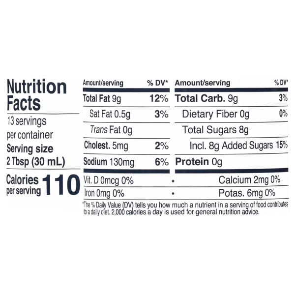 Water, Canola Oil, Sugar, Apple Cider Vinegar, Distilled Vinegar, Modified Corn Starch, Egg Yolk, Salt, Maltodextrin, Xanthan Gum, Mustard Flour, Celery Seed, Guar Gum