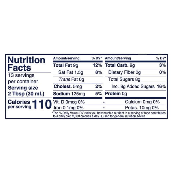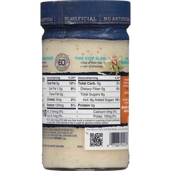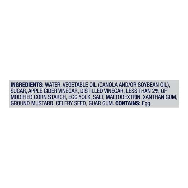 Water, Canola Oil, Sugar, Apple Cider Vinegar, Distilled Vinegar, Modified Corn Starch, Egg Yolk, Salt, Maltodextrin, Xanthan Gum, Mustard Flour, Celery Seed, Guar Gum