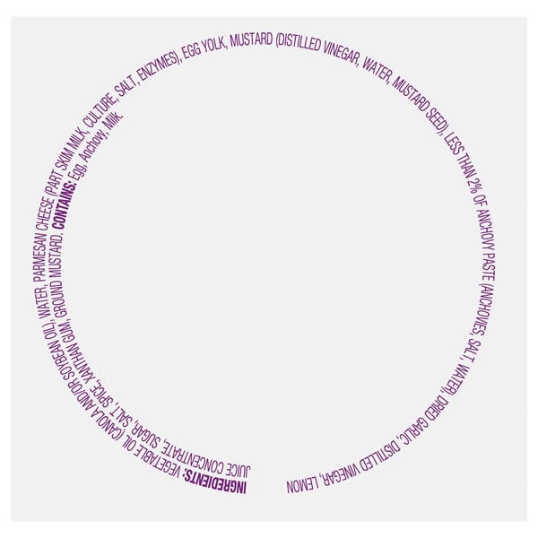 Vegetable Oil (Canola and/or Soybean Oil), Water, Parmesan Cheese (Part Skim Milk, Culture, Salt, Enzymes), Egg Yolk, Mustard (Distilled Vinegar, Water, Mustard Seed), Less than 2% of Anchovy Paste (Anchovies, Salt, Water), Dried Garlic, Distilled Vinegar, Lemon Juice Concentrate, Sugar, Salt, Spice, Xanthan Gum, Ground Mustard.