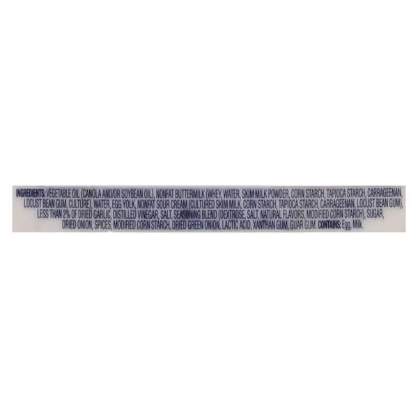 Canola Oil, Non Fat Buttermilk (whey, Water, Skim Milk Powder, Corn Starch, Tapioca Starch, Carrageenan, Locust Bean Gum, Culture), Water, Egg Yolk, Non Fat Sour Cream (cultured Skim Milk, Corn Starch, Tapioca Starch, Carrageenan, Locust Bean Gum), Salt, Distilled Vinegar, Sugar, Dried Garlic, Dried Onion, Dextrose, Spices, Modified Corn Starch, Dried Green Onion, Lactic Acid, Xanthan Gum, Guar Gum, Natural Flavors