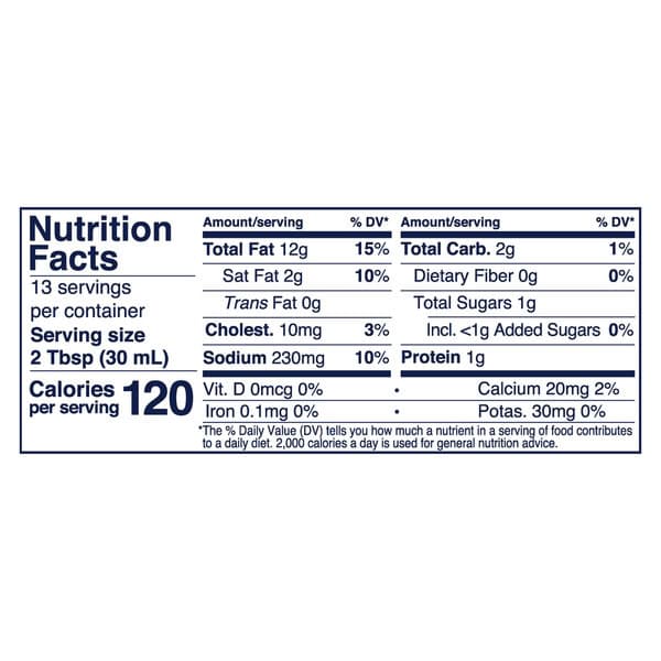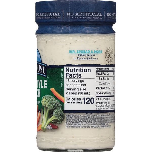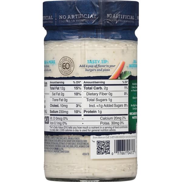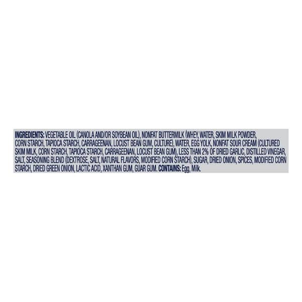 Canola Oil, Low Fat Buttermilk (skim Milk, Whey, Water, Skim Milk Solids, Whey Solids, Corn Starch, Tapioca Starch, Disodium Phosphate, Carrageenan Gum, Locust Bean Gum, Culture), Water, Egg Yolk, Non Fat Sour Cream (cultured Skim Milk, Corn Starch, Tapioca Starch, Carrageenan Gum, Locust Bean Gum), Distilled Vinegar, Salt, Natural Flavor, Sugar, Dried Garlic, Dried Onion, Spices, Modified Corn Starch, Dried Green Onion, Lactic Acid, Xanthan Gum, Guar Gum.