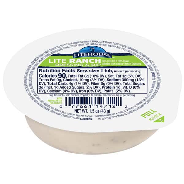 68% less fat & 60% fewer calories than regular ranch dressing. Lite Ranch – 90 calories, 8 g fat; Ranch – 230 calories, 25 g fat per serving. Nutritional Info. Call: 1-800-669-3169. www.litehousefoods.com.