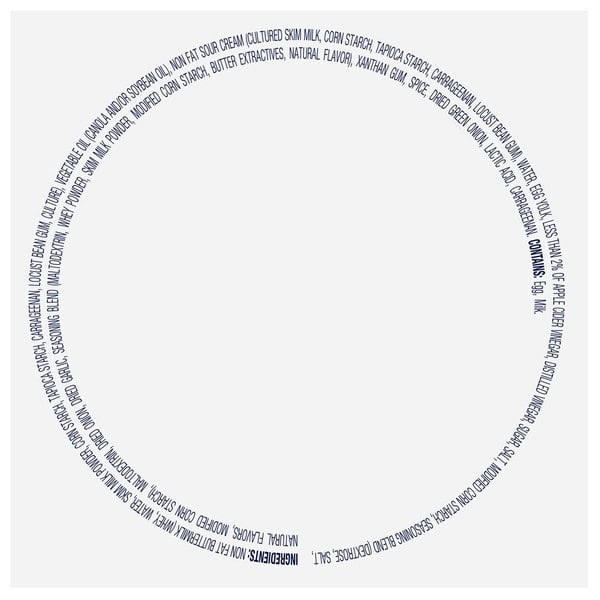 Non Fat Buttermilk (Milk, Water, Skim Milk Powder, Corn Starch, Tapioca Starch, Carrageenan, Locust Bean Gum, Culture), Canola Oil, Non Fat Sour Cream (Cultured Skim Milk, Corn Starch, Tapioca Starch, Carrageenan, Locust Bean Gum), Water, Egg Yolk, Less than 2% of Apple Cider Vinegar, Salt, Distilled Vinegar, Sugar, Modified Corn Starch, Seasoning Blend (Dextrose, Salt, Natural Flavors, Modified Corn Starch), Maltodextrin, Dried Onion, Dried Garlic, Seasoning Blend (Maltodextrin, Whey Powder, Skim Milk Powder, Modified Corn Starch, Butter Extractives, Natural Flavor), Xantham Gum, Spice, Dried Green Onion, Lactic Acid, Carrageenan.