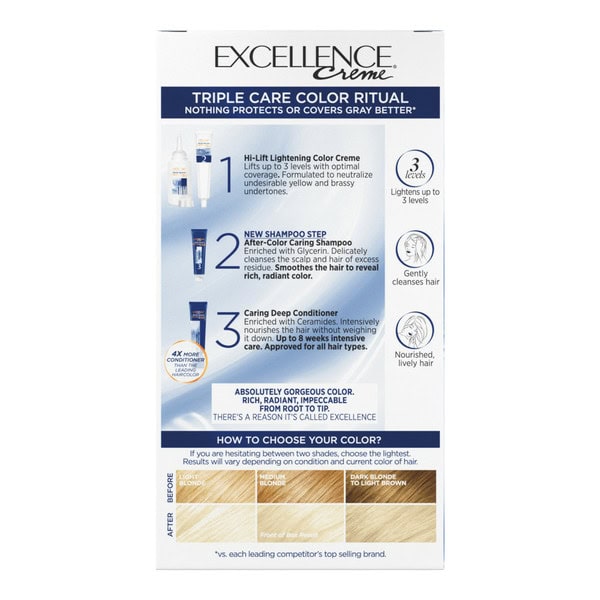 • Your Excellence just got better. Introducing the New Triple Care Color routine that deeply cares for your hair, and with 100% gray hair coverage for all hair types, even on stubborn grays. The color creme is formulated with Pro-Keratine complex that protects as it colors. The new salon inspired after color shampoo is formulated specifically to be used right after rinsing out your Excellence coloring mix. It delicately cleanses the scalp and hair of excess residue. Smoothes the hair to reveal rich, radiant color. This hair dye kit is available in a color palette ranging from Ash Blonde to Chocolate Brown to Jet Black. No permanent hair color protects better or covers grays better (vs each leading competitor’s top selling brand).
