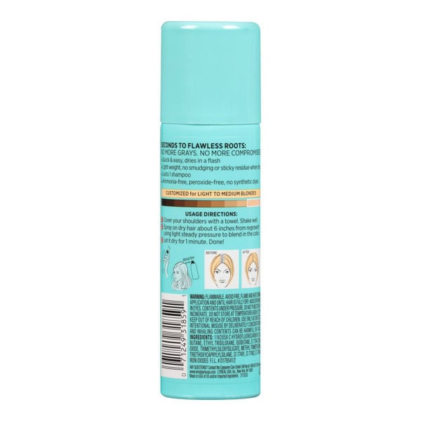 Directions: shake well. Hold can about 6 inches from hair. Spray color onto new growth and partly through the length of the hair to blend in the color. Comb and let dry for 1 minute.