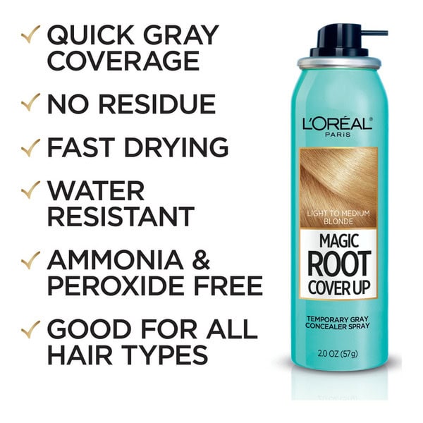 • Need a quick root touch up to cover gray hair? Try Magic Root Cover Up. This temporary hair color spray is our quickest way to cover gray and works on any hair texture or type including synthetic hair. In just 3 seconds gray roots are concealed with our light-weight, quick dry formula leaving no smudging or sticky residue when dry. One application will last until your next shampoo, plus it’s ammonia-free, peroxide-free, and contains no synthetic dyes. Magic Root Cover Up is available in a palette of eight shades which can be used on black hair, brown hair, blonde hair and even red hair. Packaging may vary. What you receive may not be what is reflected on site.