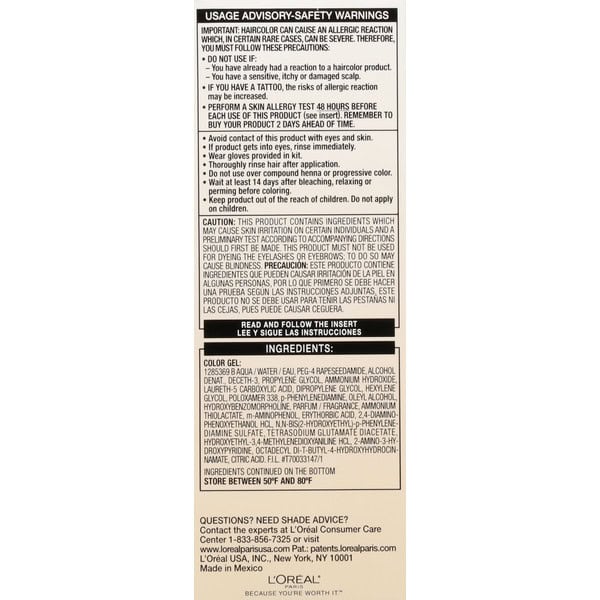 Usage Advisory-Safety Warnings: Important: haircolor can cause an allergic reaction which, in certain rare cases, can be severe. Therefore, you must follow these precautions: Do not use if: you have already had a reaction to a haircolor product. You have a sensitive, itchy or damaged scalp. If you have a tattoo, the risks of allergic reaction may be increased. Perform a skin allergy test 48 hours before each use of this product (see insert). Remember to buy your product 2 days ahead of time. Avoid contact of this product with eyes and skin. If product gets into eyes, rinse immediately. Wear gloves provided in kit. Thoroughly rinse hair after application. Do not use over compound henna or progressive color. Wait at least 14 days after bleaching, relaxing or perming before coloring. Keep product out of the reach of children. Do not apply on children. Caution: This product contains ingredients which may cause skin irritation on certain individuals and a preliminary test according to accompanying directions should first be made. This product must not be used for dyeing the eyelashes or eyebrows; to do so may cause blindness. Read and follow the insert. Hair color can cause an allergic reaction.