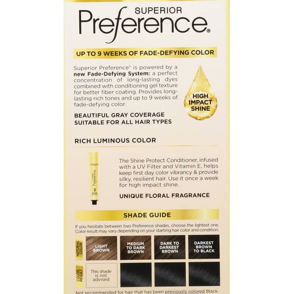 Color Gel: 1285369 B Aqua / Water / Eau, Peg-4 Rapeseedamide, Alcohol Denat., Deceth-3, Propylene Glycol, Ammonium Hydroxide, Laureth-5 Carboxylic Acid, Dipropylene Glycol, Hexylene Glycol, Poloxamer 338, P-phenylenediamine, Oleyl Alcohol, Hydroxybenzomorpholine, Parfum / Fragrance, Ammonium Thiolactate, M-aminophenol, Erythorbic Acid, 2,4-diaminophenoxyethanol Hcl, N,n-bis(2-hydroxyethyl)-p-phenylenediamine Sulfate, Tetrasodium Glutamate Diacetate, Hydroxyethyl-3,4-methylenedioxyaniline Hcl, 2-amino-3-hydroxypyridine, Octadecyl Di-t-butyl-4-hydroxyhydrocinnamate, Citric Acid. Developer Creme: 1190015 Aqua / Water / Eau, Hydrogen Peroxide, Cetearyl Alcohol, Trideceth-2 Carboxamide Mea, Ceteareth-25, Glycerin, Phosphoric Acid, Tetrasodium Etidronate, Tetrasodium Pyrophosphate, Sodium Salicylate. Shine Protect Conditioner: 1217043 A Aqua / Water / Eau, Cetearyl Alcohol, Glycerin, Behentrimonium Chloride, Candelilla Cera / Candelilla Wax / Cire De Candelilla, Amodimethicone, Cetyl Esters, Isopropyl Alcohol, Parfum / Fragrance, Phenoxyethanol, Sodium Pca, Trideceth-6, Tocopheryl Acetate, Ethylhexyl Salicylate, Linalool, Hexyl Cinnamal, Benzyl Alcohol, Chlorhexidine Digluconate, Cetrimonium Chloride, Limonene, Amyl Cinnamal, Geraniol, Benzyl Benzoate, Camelina Sativa Seed Oil, Citronellol.