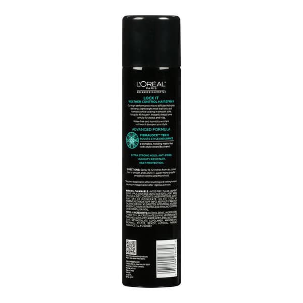 • Lock out humidity while locking in smooth style for up to 48 hours, with the lightweight mist of L’Oreal Paris Advanced Hairstyle LOCK IT Weather Control Hairspray. This extra strong hold, anti-frizz hairspray is water-free and humidity resistant so it won’t dampen your style. The perfect finishing spray for any look, from short hairstyles to medium length hairstyles to long hairstyles.