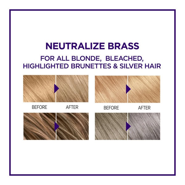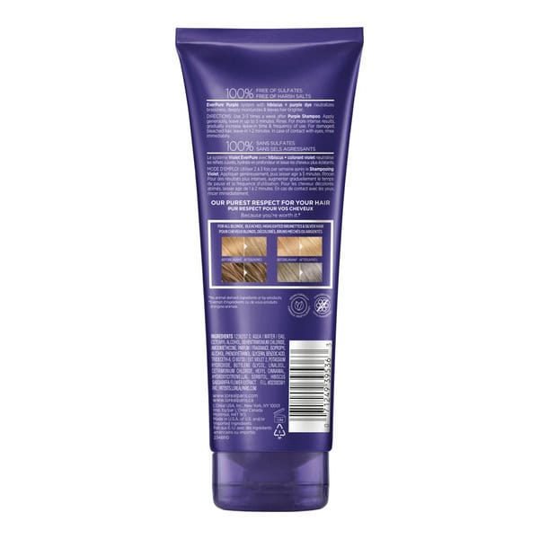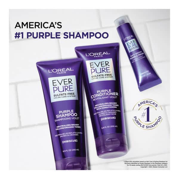 • L’Oreal Paris EverPure Sulfate Free Purple Shampoo and Conditioner provides color protection and corrects brassy blonde with yellow and orange tones
