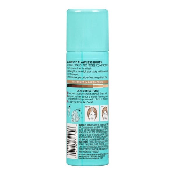 Directions: shake well. Hold can about 6 inches from hair. Spray color onto new growth and partly through the length of the hair to blend in the color. Comb and let dry for 1 minute.