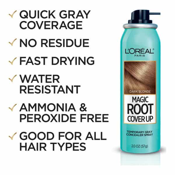• Temporary Root Cover Spray- conceals grays in seconds for flawless roots. Get seamless coverage with our lightweight formula that leaves no smudging or sticky residue when dry, and that’s ammonia and peroxide free