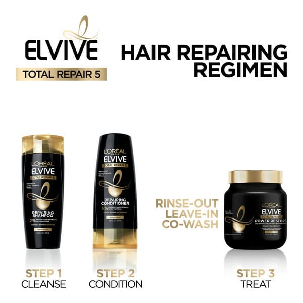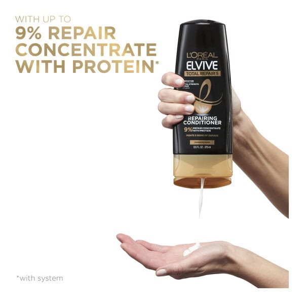 • Hair That’s Worth It, Is Worth Repairing. L’Oreal Paris Elvive Total Repair 5 strengthening system of shampoo, conditioner, and treatments feature a repair concentrate with protein delivering intense care without the weigh down for silky, healthy looking hair that feels light, is stronger, supple and easy to style. Total Repair 5 Repairing Shampoo and Repairing Conditioner create a perfect synergy combining intense care with lightness, Total Repair 5 Power Restore Multi-Use Treatment acts as a leave-in conditioner, rinse-out mask, and co-wash helping fortify hair to strengthen against future damage, Total Repair 5 Damage Erasing Balm rinse-out mask deeply conditions and reinforces hair, and Total Repair 5 Protein Recharge leave-in conditioner helps recharge strength and protect against up to up to 450° heat. Indulge in our sophisticated scent with a floral, creamy blend. From Elvive, the #1 brand in repair.* * L’Oreal calculation based in part on data reported by NielsenIQ through its Custom Hair Database for the Hair Care category for the 52 weeks ending 12/26/2020 for the Total US market and xAOC channel, according to the L’Oreal custom product hierarchy. Copyright © 2021, Nielsen Consumer LLC