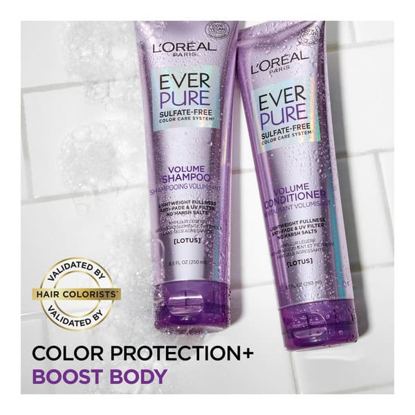 • L’Oreal Paris EverPure Sulfate Free Shampoo and Conditioner for volume provides color protection plus boosts body without weigh down