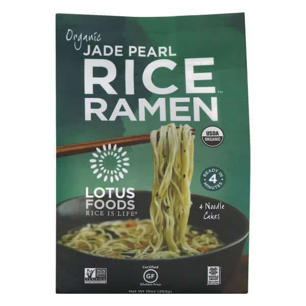 USDA Organic. Certified Organic by International Certification Services, Inc. Certified Gluten-free. Vegan. 50% Whole Grain: 20 g or more per serving. WholeGrainsCouncil.org. Non GMO Project verified. nongmoproject.org. Rice is life. Ready in 4 minutes. 4 noodle cakes. Lotus Foods brings you Organic Jade Pearl Rice Ramen, traditional Japanese-style noodles made from our specialty rice instead of wheat! In addition to being gluten free, Jade Pearl Rice contains bamboo extract with chlorophyll, giving it a light vanilla taste and a beautiful jade color. Just noodles, no soup packets. www.lotusfoods.com. For simple and tasty recipes visit lotusfoods.com. Certified B Corporation. Also try our single-serve Rice Ramen with soup, Rice Ramen Soup Cups, Pad Thai Rice Noodles and Organic Heirloom Rice. Product of China.