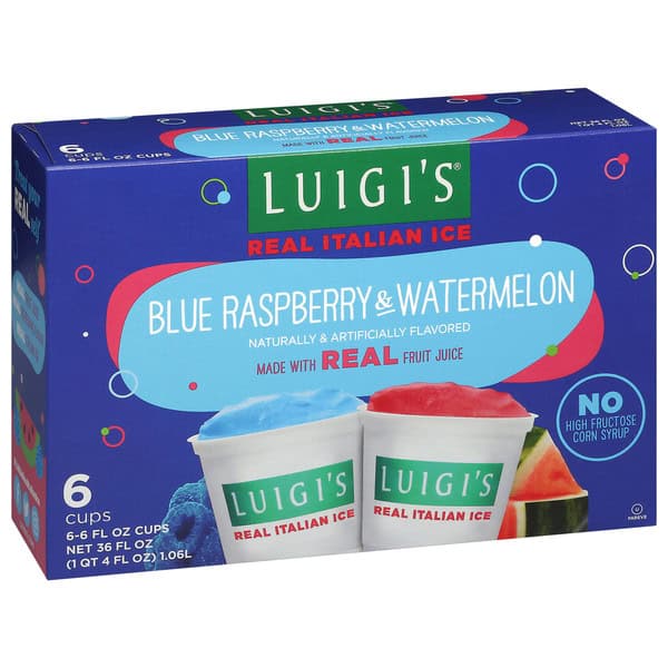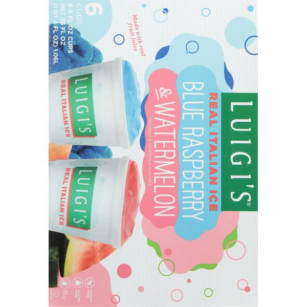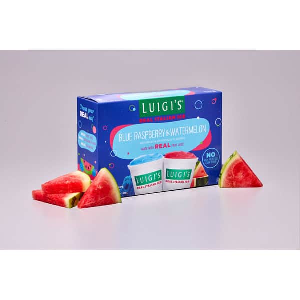 Experience the refreshing taste of Luigis Italian ice, now available in the delightful flavors of blue raspberry and watermelon variety pack. Treat yourself to a burst of fruity goodness with every bite, as these flavors combine to create a truly irresistible frozen treat. Enjoy this low-calorie, fat-free dessert. Luigi’s Italian Ice is a frozen treat conveniently packaged for easy storage and enjoyment anytime of the day, making it a perfect addition for your summer treats. So, peel that top, grab your spoon, and let the refreshing, frozen, real-fruit-juice fun begin.