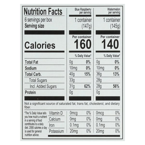 Ingredients: Blue Raspberry: Water, Syrup Blend (sucrose Syrup And Corn Syrup), Apple Juice From Concentrate (water, Apple Juice Concentrate), Sugar, Contains 2% Or Less Of The Following: Natural And Artificial Flavor (with Fd&c Blue #1), Citric Acid, Stabilizer (guar Gum, Xanthan Gum, Dextrose). Ingredients Watermelon: Water, Syrup Blend (sucrose Syrup And Corn Syrup), Apple Juice From Concentrate (water, Apple Juice Concentrate), Contains 2% Or Less Of The Following: Natural And Artificial Flavor, Citric Acid, Stabilizer (guar Gum, Xanthan Gum, Dextrose), Fd&c Red #40.