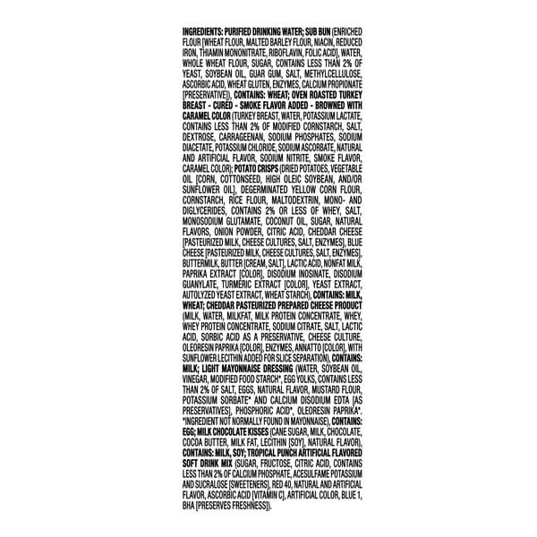 Purified Drinking Water, Sub Bun (enriched Flour [wheat Flour, Malted Barley Flour, Niacin, Reduced Iron, Thiamin Mononitrate, Riboflavin, Folic Acid], Water, Whole Wheat Flour, Sugar, Contains Less Than 2% Of Yeast, Soybean Oil, Guar Gum, Salt, Methylcellulose, Ascorbic Acid, Wheat Gluten, Enzymes, Calcium Propionate [preservative], Soy Lecithin), Oven Roasted Turkey Breast – Cured – Smoke Flavor Added – Browned With Caramel Color (turkey Breast, Water, Potassium Lactate, Contains Less Than 2% Of Modified Cornstarch, Salt, Dextrose, Carrageenan, Sodium Phosphates, Sodium Diacetate, Potassium Chloride, Sodium Ascorbate, Natural And Artificial Flavor, Sodium Nitrite, Smoke Flavor, Caramel Color), Potato Crisps (dried Potatoes, Vegetable Oil [corn, Cottonseed, High Oleic Soybean, And/or Sunflower Oil], Degerminated Yellow Corn Flour, Cornstarch, Rice Flour, Maltodextrin, Mono- And Diglycerides, Contains 2% Or Less Of Whey, Salt, Monosodium Glutamate, Coconut Oil, Sugar, Natural Flavors, Onion Powder, Citric Acid, Cheddar Cheese [pasteurized Milk, Cheese Cultures, Salt, Enzymes], Blue Cheese [pasteurized Milk, Cheese Cultures, Salt, Enzymes], Buttermilk, Butter [cream, Salt], Lactic Acid, Nonfat Milk, Paprika Extract [color], Disodium Inosinate, Disodium Guanylate, Turmeric Extract [color], Yeast Extract, Autolyzed Yeast Extract, Wheat Starch), Pasteurized Prepared Cheddar Cheese Product (milk, Water, Milkfat, Milk Protein Concentrate, Whey, Whey Protein Concentrate, Sodium Citrate, Salt, Lactic Acid, Sorbic Acid As A Preservative, Cheese Culture, Oleoresin Paprika [color], Enzymes, Annatto [color], With Sunflower Lecithin Added For Slice Separation), Light Mayonnaise Dressing (water, Soybean Oil, Vinegar, Modified Food Starch *, Egg Yolks, Contains Less Than 2% Of Salt, Eggs, Natural Flavor, Mustard Flour, Potassium Sorbate* And Calcium Disodium Edta [as Preservatives], Phosphoric Acid*, Oleoresin Paprika*. Ingredient Not Normally Found In Mayonnaise), Milk Chocolate Kisses (cane Sugar, Milk, Chocolate, Cocoa Butter, Milk Fat, Lecithin [soy], Natural Flavor), Tropical Punch Artificial Flavored Soft Drink Mix (sugar, Fructose, Citric Acid, Contains Less Than 2% Of Calcium Phosphate, Acesulfame Potassium And Sucralose [sweeteners], Red 40, Natural And Artificial Flavor, Ascorbic Acid [vitamin C], Artificial Color, Blue 1, Bha [preserves Freshness])
