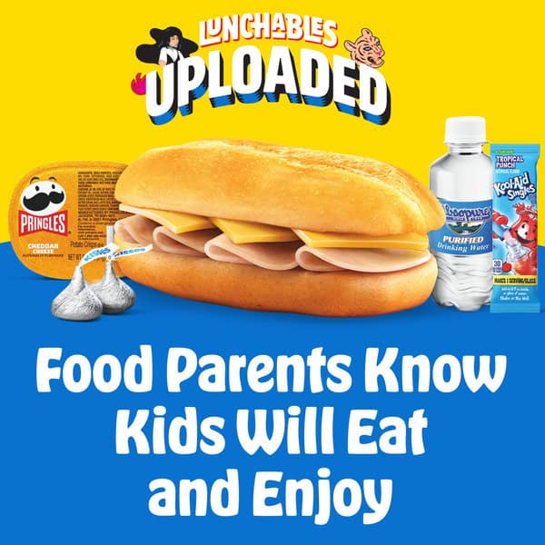 • One 15 oz Lunchables Uploaded Turkey and Cheddar Sub Sandwich with Cheddar Pringles, Hershey’s Milk Chocolate Kisses, Water and Kool-Aid Powdered Drink Mix Snack Kit