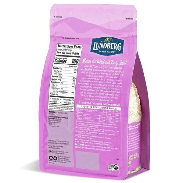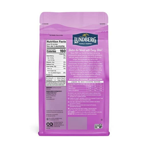 Stovetop Cooking Instructions: Liquid to Rice Cooking Ratios: Servings (about 3/4 cup cooked rice): 2; Rice (dry): 1/2 cup; Water or broth: 3/4 cup; Butter or oil (optional): 1-1/2 tsp. Servings (about 3/4 cup cooked rice): 4-5; Rice (dry): 1 cup; Water or broth: 1-1/2 cup; Butter or oil (optional): 1 Tbsp. Servings (about 3/4 cup cooked rice): 8-9; Rice (dry): 2 cups; Water or broth: 3 cups; Butter or oil (optional): 2 Tbsp. This product is raw and must be cooked in order to enjoy its delicious flavor. 1. Using a fine mesh sieve, thoroughly rinse desired amount of rice under cold water for 1-2 minutes and drain. 2. Combine rice, liquid, and butter or oil in a 2 qt. saucepan (/2 cup or 1 cup) or a 4 qt. saucepan (2 cups) and bring to a boil. 3. Cover with a tight-fitting lid. Reduce heat to maintain a low simmer and cook for 15 minutes. 4. With lid on, remove from heat and let steam for 10 minutes. Fluff with a fork and enjoy. Tip: If rice is too firm at the end of cooking, it may be necessary to add 1-2 Tbsp. liquid and cook for an additional 3-5 minutes. Rice Cooker Instructions: To prepare in a rice cooker, use the same liquid to rice ratio. Instant Pot: Visit www.lundberg.com for specific instructions.