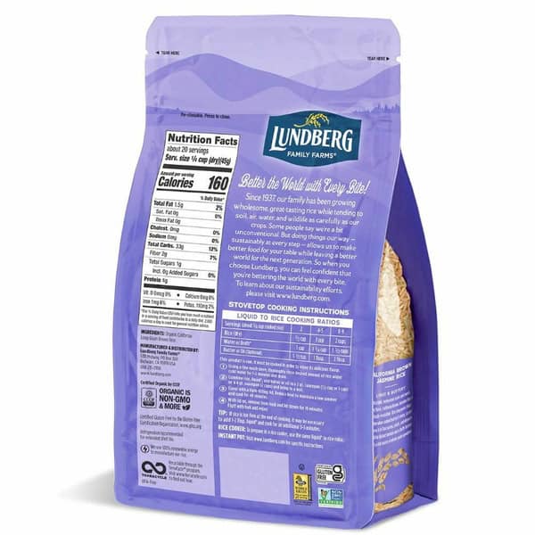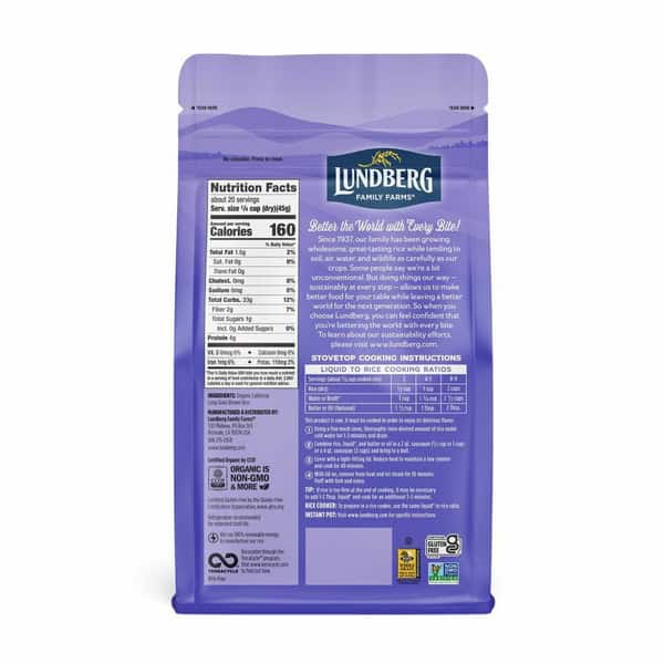 Stovetop Cooking Instructions: Liquid to Rice Cooking Ratios: Serving (about 3/4 cup cooked rice): 2; Rice (dry): 1/2 cup; Water or Broth: 1 cup; Butter or Oil (optional): 1-1/2 tsp. Serving (about 3/4 cup cooked rice): 4 – 5; Rice (dry): 1 cup; Water or Broth: 1 3/4 cups; Butter or Oil (optional): 1 tbsp. Serving (about 3/4 cup cooked rice): 8 – 9; Rice (dry): 2 cups; Water or Broth: 3 1/2 cups; Butter or Oil (optional): 2 tbsp. This product is raw and must be cooked in order to enjoy its delicious flavor. 1. Using a fine mesh sieve, thoroughly rinse desired amount of rice under cold water for 1-2 minutes and drain. 2. Combine rice, liquid (Water or broth), and butter or oil in a 2 qt. saucepan (1/2 cup or 1 cup) or a 4 qt. saucepan (2 cups) and bring to boil. 3. Cover with a tight-fitting lid. Reduce heat to maintain a low simmer and cook for 40 minutes. 4. With lid on, remove from heat and let steam for 10 minutes. Fluff with a fork and enjoy. Tip: If rice is too firm at the end of cooking, it may be necessary to add 1-2 tbsp liquid (Water or broth) and cook for an additional 3-5 minutes. Rice Cooker: To prepare in a rice cooker, use the same liquid (Water or broth) to rice ratio. Instant Pot: Visit www.lundberg.com for specific instructions.