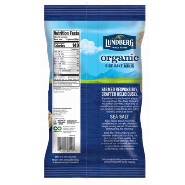 Enjoy toasty brown rice tumbled in just the right amount of simple, savory sea salt. You can snack without a second thought knowing these Lundberg Rice Cake Minis are: