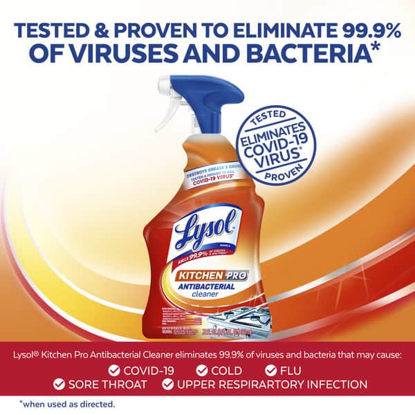 Help protect your family from harmful foodborne illness with Lysol Pro Antibacterial Kitchen Cleaner. Be assured that there are no harsh chemical residues which is ideal for food contact surfaces. The grease fighting power of this effective kitchen cleaner helps to clean up even one of the toughest kitchen messes, while killing 99.9% of viruses & bacteria*. It deodorizers with a fresh citrus scent, ideal for use on countertops, sinks, stovetops, and more to help keep your kitchen healthy and clean. EPA Reg #777-91.
