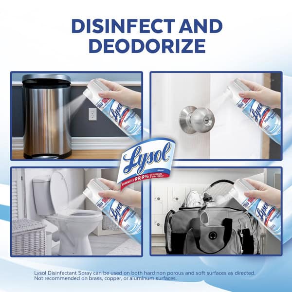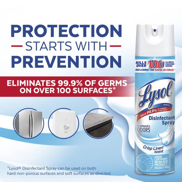Lysol Disinfectant Spray kills 99.9% of bacteria and viruses, including cold, flu, and coronavirus (when used as directed). This disinfectant spray sanitizes, disinfects and eliminates odors. Use this disinfecting spray on high touch hard surface areas. Let Lysol bring you and your family peace of mind when it comes to disinfecting against germs. You can also use this disinfecting spray on soft surfaces, like couches, coats, sports bags, strollers and backpacks.