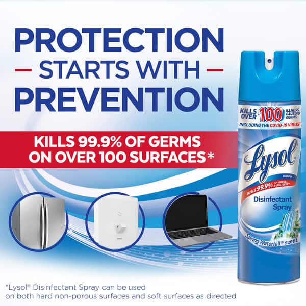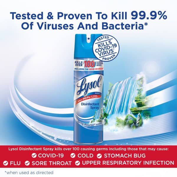 Lysol Disinfectant Spray kills 99.9% of bacteria and viruses, including cold, flu, and coronavirus (when used as directed). This disinfectant spray sanitizes, disinfects and eliminates odors. Use this disinfecting spray on high touch hard surface areas. Let Lysol bring you and your family peace of mind when it comes to disinfecting against germs. You can also use this disinfecting spray on soft surfaces, like couches, coats, sports bags, strollers and backpacks. How to Use Lysol Disinfecting Spray? To Sanitize and Disinfect: Pre-clean surface. Hold can upright 6 to 8″ from surface. Spray 3 to 4 seconds until covered with mist. To Sanitize: surfaces must remain wet for 10 seconds then allow to air dry. To Disinfect: hard surfaces must remain wet for 3 minutes then allow to air dry and soft surfaces must remain wet for 10 minutes and then allow to air dry. To Control Mold and Mildew: (1) Apply to a pre-cleaned surface. (2) Allow to remain wet for 3 minutes. (3) Let air dry. (4) Repeat applications in weekly intervals or when mold and mildew growth appears. For more than a century, Lysol has been helping to protect families from illness-causing germs. To learn more about our mission and find further disinfecting solutions, solutions for household cleaning, and disinfectant spray products, visit our website or check out our instagram. ​