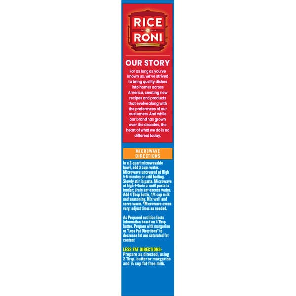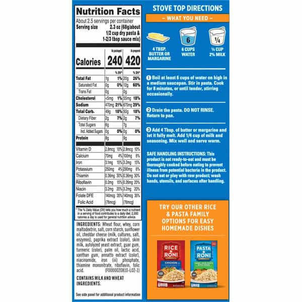 Stove Top Directions: What you need. 4 tbsp. butter or margarine. 6 cups water. 1/4 cup 2% milk. 1. Boil at least 6 cups of water on high in a medium saucepan. Stir in pasta. Cook for 8 minutes, or until tender, stirring occasionally. 2. Drain the pasta. Do not rinse. Return to pan. 3. Add 4 Tbsp. of butter or margarine and let it fully melt. Add 1/4 cup of milk and seasoning. Mix well and serve warm. Microwave Directions: In a 2-quart microwavable bowl, add 3 cups water. Microwave uncovered at high 5 – 6 minutes or until boiling. Slowly stir in pasta. Microwave at high 4 – 6 min or until pasta is tender; drain any excess water. Add 4 tbsp butter, 1/4 cup milk and seasoning. Mix well and serve warm. Microwave ovens vary; adjust times as needed. As prepared nutrition facts information based on 4 tbsp butter. Prepare with margarine or less fat directions to decrease fat and saturated fat content. Less Fat Directions: Prepare as directed, using 2 tbsp. butter or margarine and 1/4 cup fat-free milk.