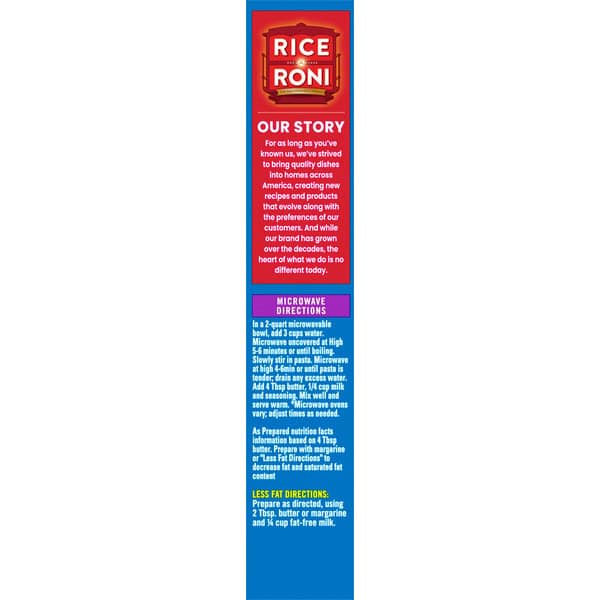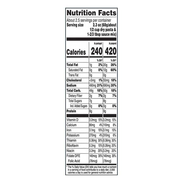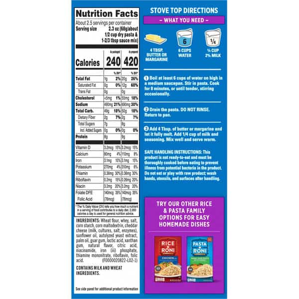 Stove Top Directions: What You Need: 4 tbsp. butter or margarine. 6 cups water. 1/4 cup 2% milk. 1. Boil at least 6 cups of water on high in a medium saucepan. Stir in pasta. Cook for 8 minutes, or until tender, stirring occasionally. 2. Drain the pasta. Do not rinse. Return to pan. 3. Add 4 tbsp. of butter or margarine and let it fully melt. Add 1/4 cup of milk and seasoning. Mix well and serve warm. Microwave Directions: In a 2-quart microwavable bowl, add 3 cups water. Microwave uncovered at high 5-6 minutes or until boiling. Slowly stir in pasta. Microwave at high 4-6 min or until pasta is tender; drain any excess water. Add 4 tbsp butter, 1/4 cup milk and seasoning. Mix well and serve warm. Microwave ovens vary; adjust times as needed. As Prepared nutrition facts information based on 4 tbsp butter. Prepare with margarine or “Less Fat Directions” to decrease fat and saturated fat content. Less Fat Directions: Prepare as directed, using 2 tbsp. butter or margarine and 1/4 cup fat-free milk. Fat reduced to 8 g from 14 g per serving. Saturated fat reduced to 5 g from 8 g per serving. See nutrition facts panel for sodium content.