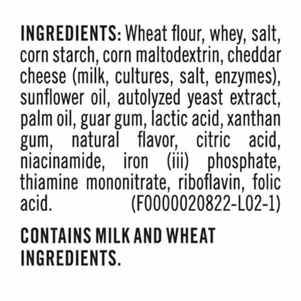 Wheat Flour, Whey, Salt, Corn Starch, Corn Maltodextrin, Cheddar Cheese (milk, Cultures, Salt, Enzymes), Sunflower Oil, Autolyzed Yeast Extract, Palm Oil, Guar Gum, Lactic Acid, Xanthan Gum, Natural Flavor, Citric Acid, Niacinamide, Iron (iii) Phosphate, Thiamine Mononitrate, Riboflavin, Folic Acid