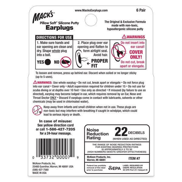 Maximum comfort. Hypoallergenic original formula. Helps prevent swimmer’s ear. Read directions and warnings on back of box before using. Snore proof. Water proof. No doctor recommended. Swim, sleep, study, shower, work, travel, sports, loud events, flying discomfort, etc. Safe for use with ear tubes. The original & exclusive formula made with non-toxic, hypoallergenic silicone putty. Noise reduction rating 22 decibels (when used as directed). The range of noise reduction ratings for existing hearing protectors is approximately 0 to 30 (high numbers denote greater effectiveness). Federal law prohibits removal of this label prior to purchase EPA label required by USEPA regulation 40 CFR part 211 subpart B. CE listed. www.MacksEarplugs.com. Recyclable package. Made Sweden.