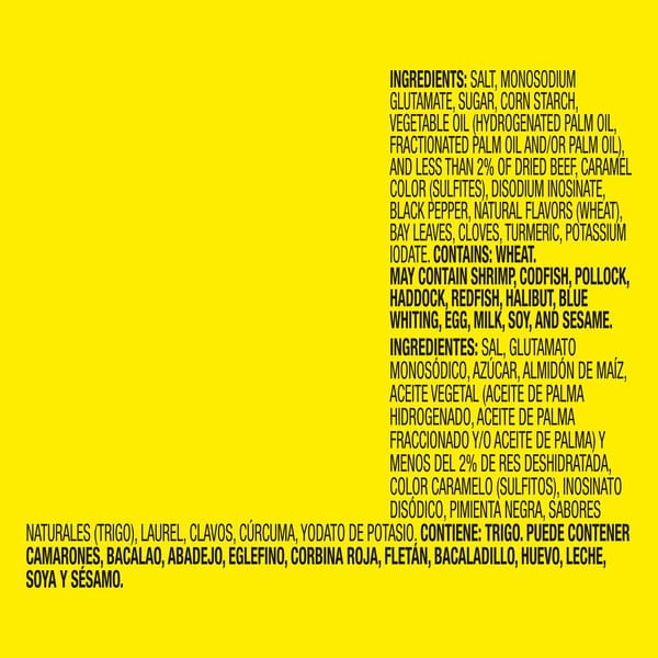Salt, Monosodium Glutamate, Sugar, Partially Hydrogenated Palm Oil, Cornstarch, And Less Than 2% Of Dehydrated Beef, Caramel Color, Natural Flavor, Disodium Inosinate, Spices, Turmeric, Tbhq (preservative).