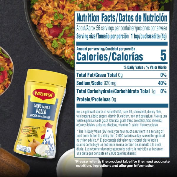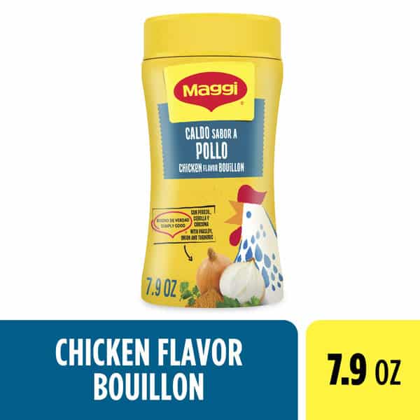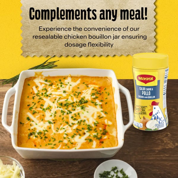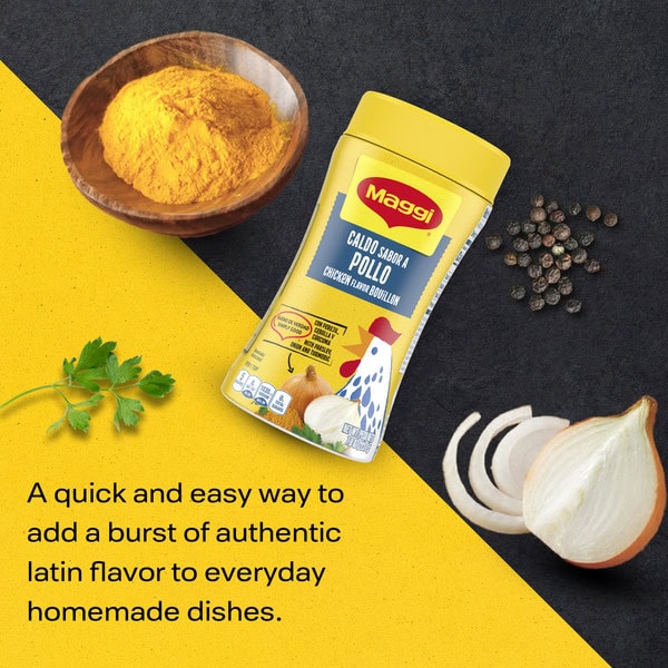 Maggi Caldo Sabor a Pollo Chicken Flavor Bouillon is a delightful blend of taste and convenience. Bring your family together with our seasoned bouillon designed to elevate your everyday cooking by infusing it with an authentic Latin flavor. Use this flavorful seasoning to quickly mix up a chicken soup base for an easy-to-make soup. This convenient bouillon is perfect for those busy weekdays when you want to whip up a quick chicken and rice dish that doesn’t compromise on flavor. Our chicken bouillon and soup seasonings are naturally flavored, and made with ingredients you love, ensuring a delicious taste in every spoonful. Get inspired by the creators of Maggi soup and enhance a variety of recipes with the delicious, no-cholesterol chicken flavor bouillon