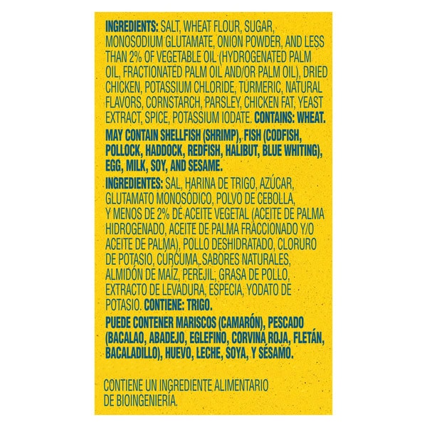 Salt, Cornstarch, Monosodium Glutamate, Sugar, Partially Hydrogenated Palm Oil, Garlic Powder, Onion Powder, And Less Than 2% Of Dehydrated Chicken**, Turmeric, Spices, Chicken Fat**, Disodium Inosinate, Natural Flavor.