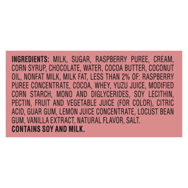 Milk, Sugar, Water, Cream, Chocolate Liquor, Corn Syrup, Skim Milk, Coconut Oil, Cocoa Butter, Raspberry Puree, Milk Fat, Less Than 2% Of: Raspberry Juice Concentrate, Cocoa, Modified Corn Starch, Fruit And Vegetable Juice (for Color), Carrageenan, Citric Acid, Fruit And Vegetable Concentrates (color), Natural Flavor, Salt, Fructose, Soy Lecithin, Monoglycerides, Locust Bean Gum, Guar Gum, Vanilla Extract