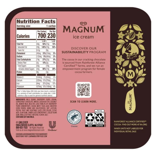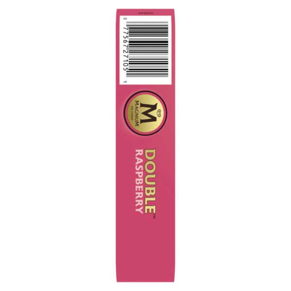 • Magnum’s Double Raspberry Ice Cream Bar features raspberry ice cream double dipped in milk chocolate with a layer of luscious raspberry sauce