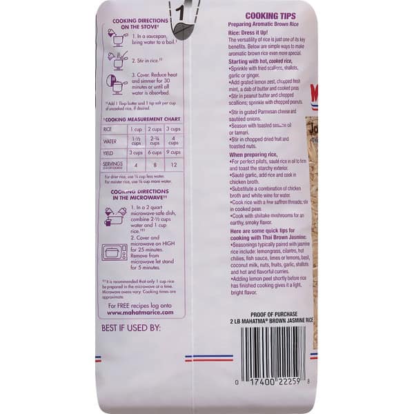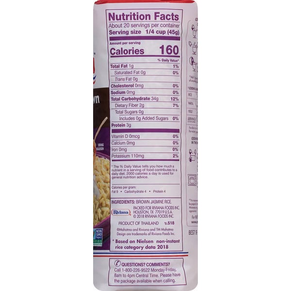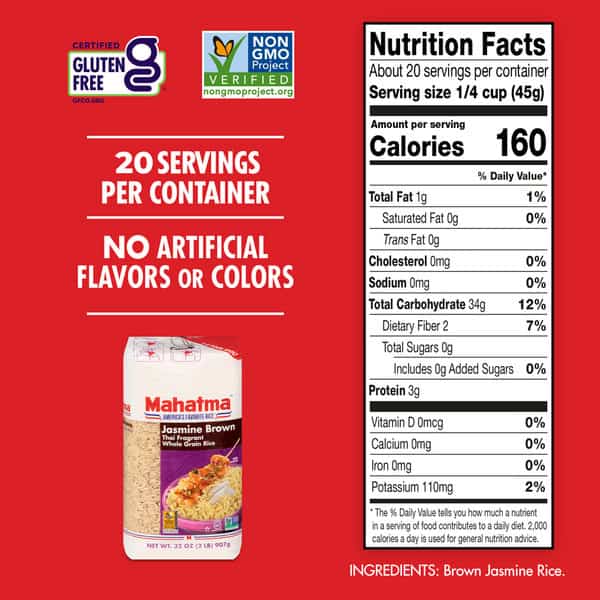 Mahatma Jasmine Brown Rice is 100% whole grain with the aroma and flavor of Thai Jasmine Rice. Enjoying whole grain foods is now easier with so many options! Brown rice is a great addition to any meal – plus, it offers a new flavor to swap in for your traditional white rice side dish. Our 100% whole grain Thai Jasmine Brown Rice is de-hulled to remove the outer shell, but still has the germ and bran layer intact. This aromatic Thai delicacy is perfect for serving with stir-fried vegetables and meats as well as other grilled or fried foods. As a family trusted brand, Mahatma Jasmine Brown Rice is Gluten-Free, Non-GMO Project Verified, free of MSG and contains no added preservatives.