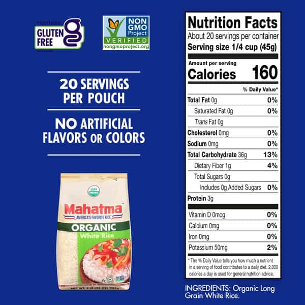 Mahatma Organic White Rice offers you exactly what you need when you’re looking to satisfy a craving. Each 2 lb. bag includes a neutral, mild taste that will add delicious flavor to any meal. Add slender, fluffy rice to your meals that won’t sacrifice quality ingredients – no artificial preservatives, flavors, or colors. Our rice is USDA Organic Certified, gluten free, kosher, Non-GMO Project verified, MSG free, vegan, and vegetarian, meaning there are endless mealtime possibilities with Mahatma Rice. Add Mahatma Organic White Rice to all your favorite meals. Mahatma has been trusted by American families for over 100 years, providing consistent quality and flavor in every bag. Mahatma Rice is crafted with quality ingredients and premium flavors – keep a bag or two on hand and you’ll be prepared for whatever life throws at you.