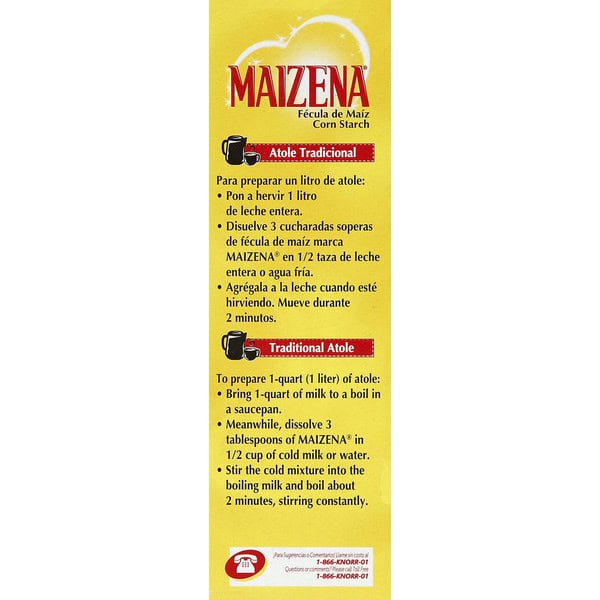 Tips: Fresh and fluffy cakes! For extra tender cakes and cookies, substitute Maizena for 1/3 of the flour used in your favorite recipes. Juicy and hearty meats! When preparing meatballs, hamburgers or meatloaf, add 2 tablespoons of Maizena to every 1 lb (450 grams) of ground meat. Crispy coatings! To make a crispy coating for your chicken or fish, combine 1 cup of Maizena, 1 egg and 1/4 cup of milk to make a batter. Coat chicken or fish and fry until golden. Delicious fruit smoothies! Follow the directions for traditional Atole, then freeze the mixture until it is frosty. Transfer it to a blender, add your favorite fruit and process until smooth and frothy. Add sugar to taste, if desired. Pour into a tall glass and enjoy! Traditional Atole: To prepare 1-quart (1 liter) of atole: Bring 1-quart of milk to a boil in a saucepan. Meanwhile, dissolve 3 tablespoons of Maizena in 1/2 cup of cold milk or water. Stir the cold mixture into the boiling mix and boil about 2 minutes, stirring constantly.